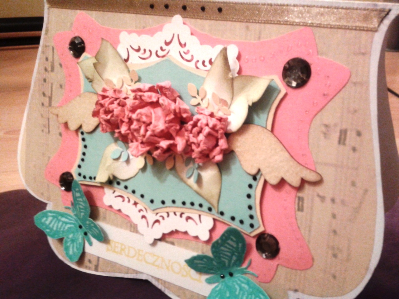 Jakiś czas temu zrobiłam karteczkę dla mojej siostry nie mając pod ręką żadnych specjalistycznych papierów, dziurkaczy o wykrojnikach nawet nie myśląc. Wykorzystałam kartkę ze starego romansidła znalezionego kiedyś na strychu, małych muszelek z jakiejś taniej pamiątki z nad morza i naprędce wyszło coś takiego: